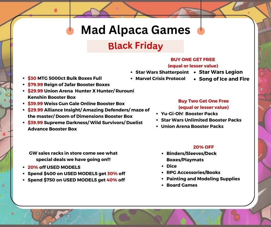 Here at Mad Alpaca Games, we provide more than just games on the shelves. We also provide: